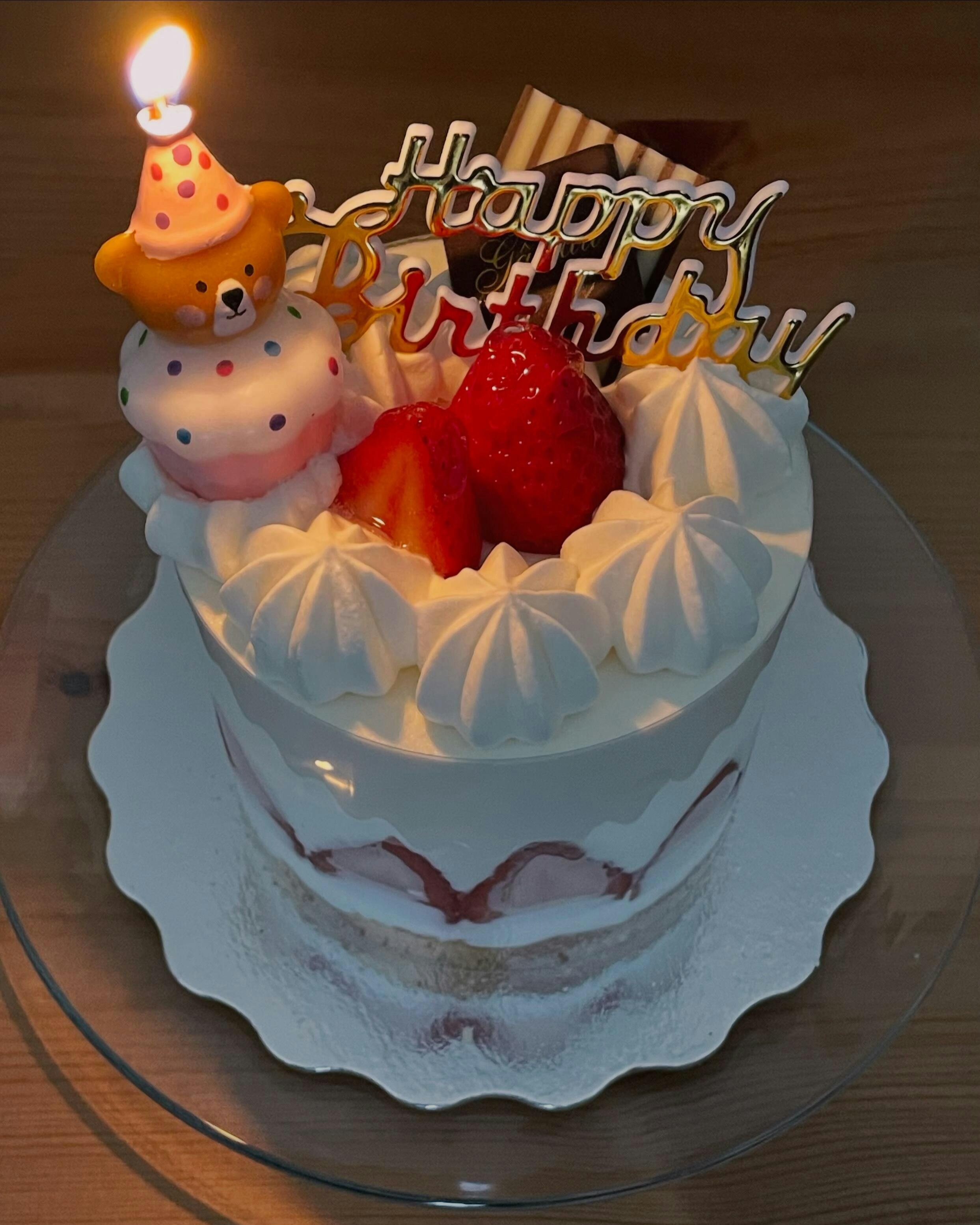 Fresh Cream Strawberry Cake has vanilla sponge with fresh cream made with 100% Dairy. There are fresh strawberries inside the cake and on top of the cake and gold edible foil on top of strawberries.